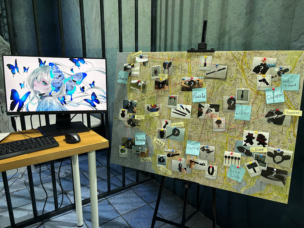 メインタイトルが映されたPCと証拠(?)が貼られた地図がミステリアスで素敵でした✨